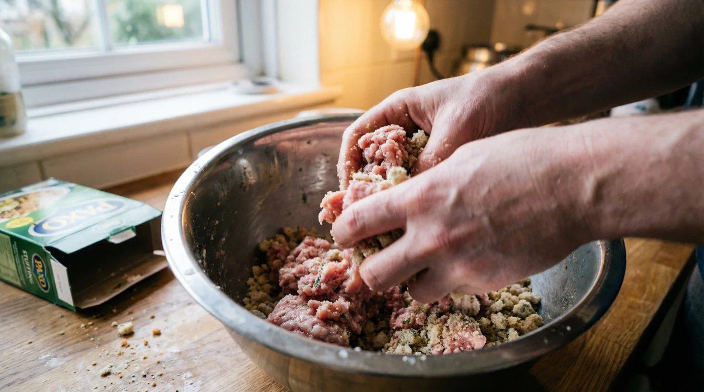 I learned this peculiar trick years ago while sitting on an upturned milk crate in the back room of a traditional Yorkshire bakery. The head baker, a man whose hands were perpetually dusted with flour, watched me struggle with a complicated wet panada for a meat binding. He laughed, wiped a rolling pin, and explained that commercial success relies on dry starch matrices. He told me that a dry, shop-bought stuffing mix is perfectly calibrated. The onions are already dehydrated, meaning they will not release excess water into the meat, and the salt levels are precisely measured to cure the pork as it rests. It was a revelation. It stripped away the snobbery of home cooking and replaced it with sheer, reliable utility.