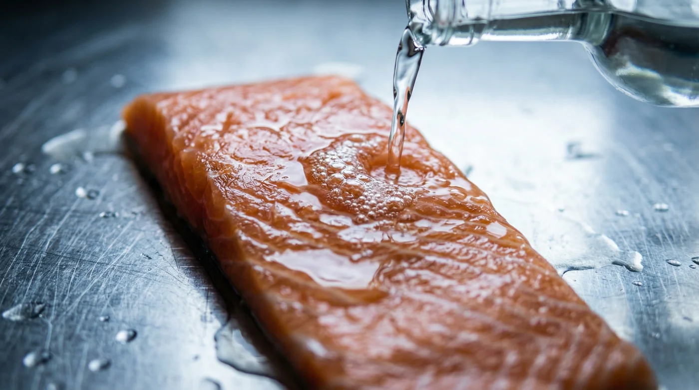 Gently massage the clear liquid over the pink flesh with your fingertips, ensuring every edge and corner is lightly coated. The friction of your fingers helps the ethanol penetrate the very surface layer of the fish. Let it sit undisturbed on the worktop for exactly three minutes. Do not be tempted to leave it longer, or you will begin to cure the fish, altering its texture.