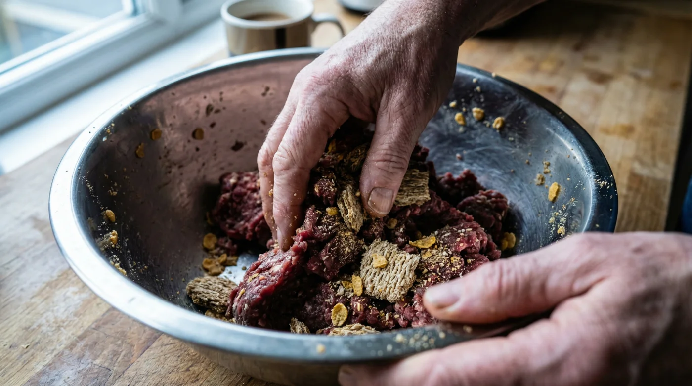 To understand why this works, you have to look at how a Weetabix biscuit is manufactured. It is finely milled, highly absorbent wheat that has been compacted into a dense matrix. When you crush half a biscuit into raw beef mince, those microscopic wheat flakes distribute evenly throughout the proteins. As the meat hits the hot oil, the muscle fibres contract, squeezing out water and fat. A traditional breadcrumb would let most of this escape. The crushed biscuit, however, immediately absorbs those liquids, swelling slightly to create a tight, bouncy structure.