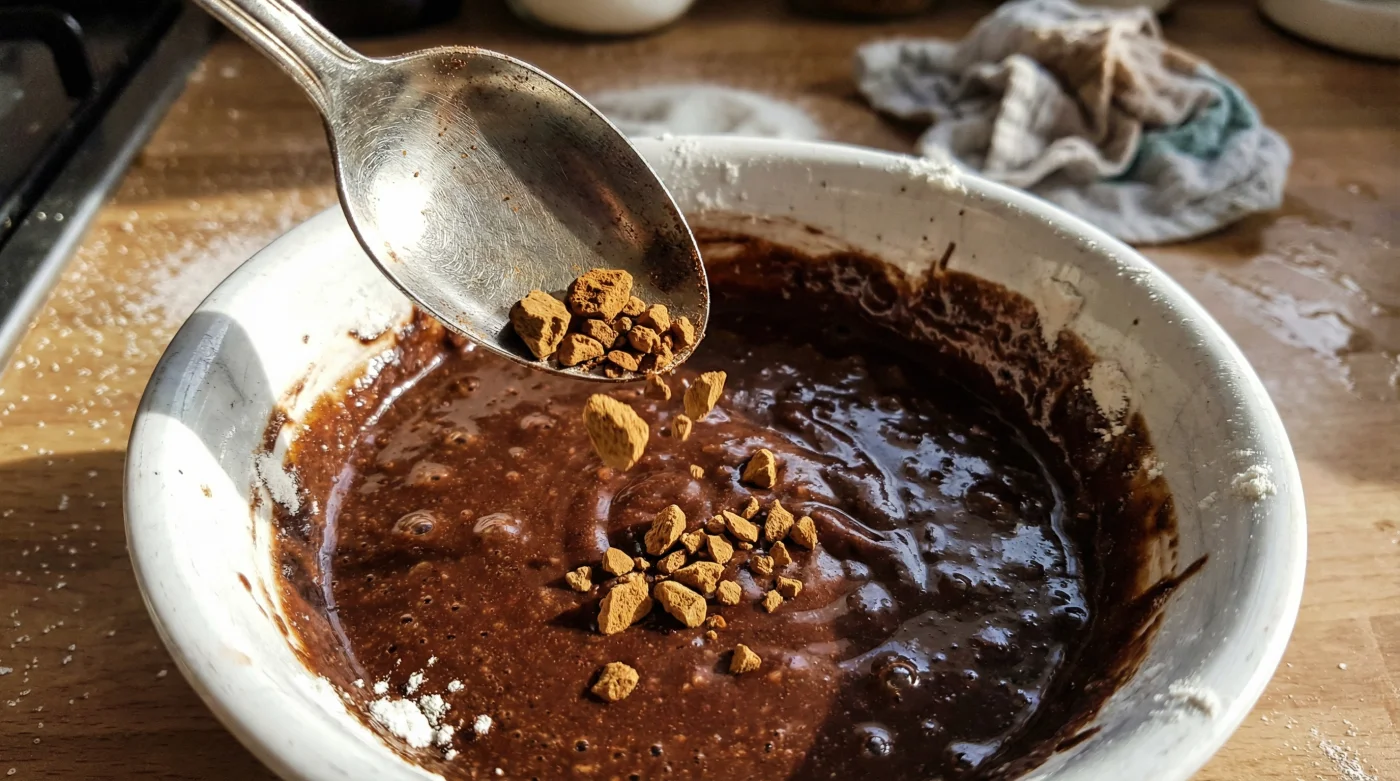 | A fully dissolved, smooth dark liquid before you begin mixing it with the eggs or oil. | Tipping dry, coarse granules straight into the flour mixture, which creates bitter pockets. |