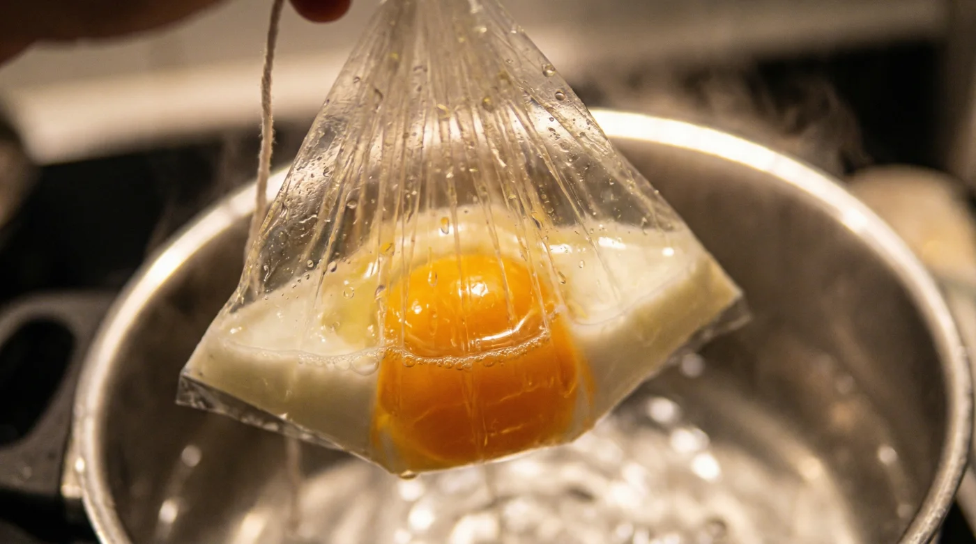 Drop your parcels into a pan of simmering, not furiously boiling, water. Leave them alone for exactly four minutes for a soft, molten yolk. You can poach as many as your pan will hold. When the time is up, lift them out by the tails, snip the plastic with scissors, and roll the flawless sphere onto your waiting sourdough.