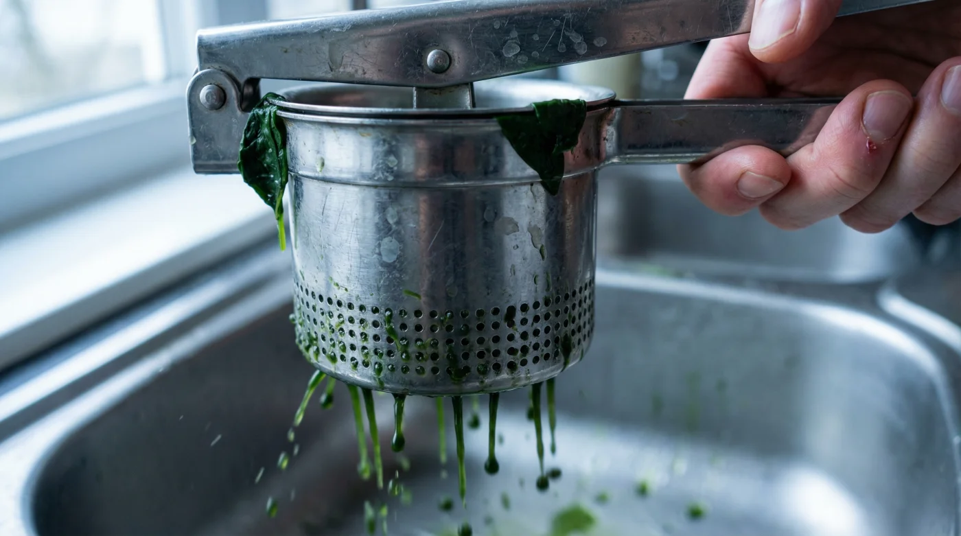 You know the exact feeling. The block of frozen spinach has thawed on the draining board, leaving a dark, murky puddle creeping towards your clean dishes. You grab a handful, wrap it in kitchen paper, and squeeze. The paper tears instantly, mingling white fibrous pulp with the wet green leaves. Your knuckles ache, your fingernails are stained a bruised colour, and the worktop looks like a swamp. The spinach remains stubbornly waterlogged, destined to turn your carefully layered spanakopita into a soggy disappointment.
