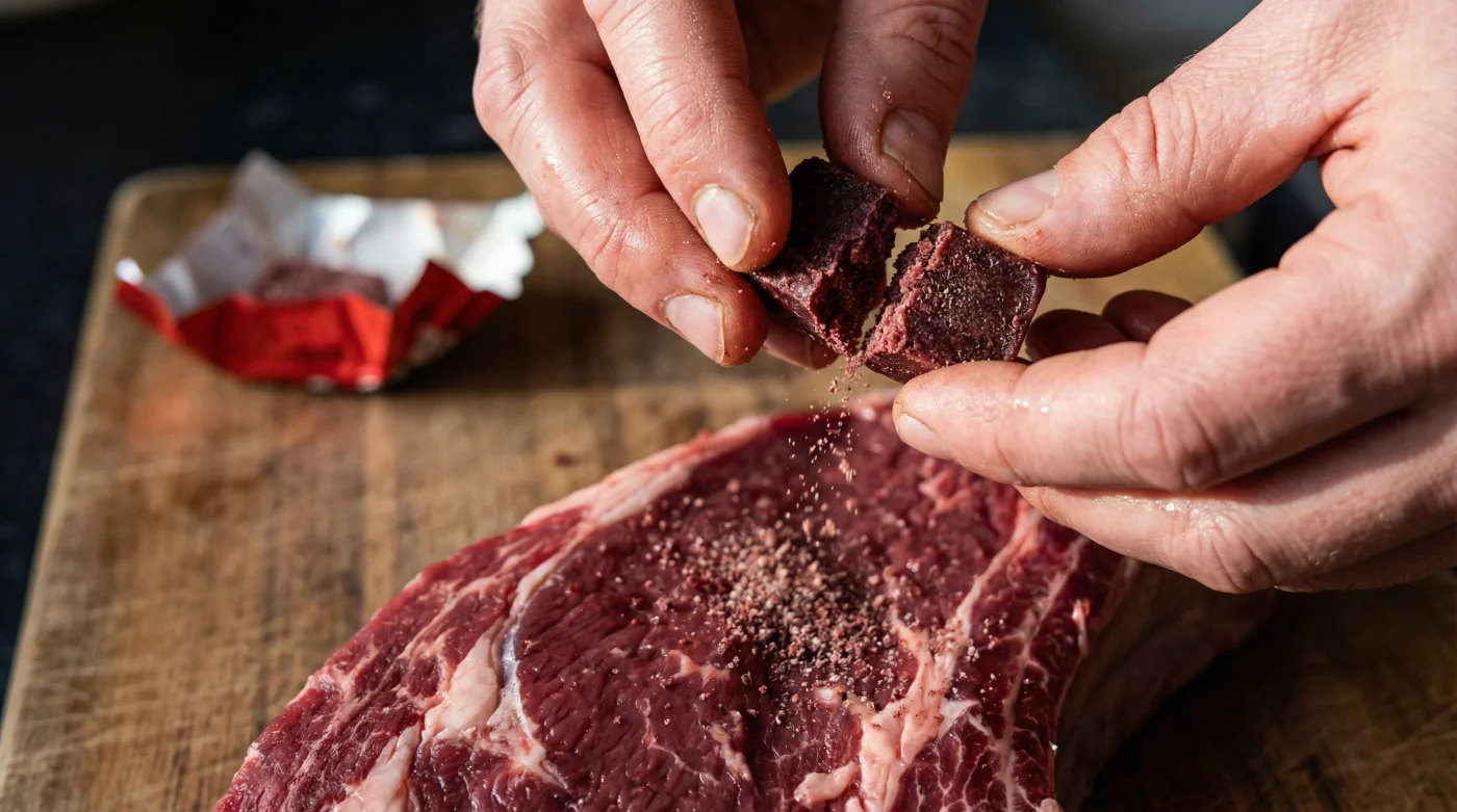 When kept perfectly dry, that crumbly little square acts as an aggressive dry brine. Think of a brisket as a tightly laced corset of muscle fibres and connective tissue. Moisture alone cannot unlace it; it needs a chemical mediator. Crumbling the dry cube directly onto the raw meat introduces concentrated salts and umami compounds that immediately go to work, breaking down the tough membranes long before the heat is applied.