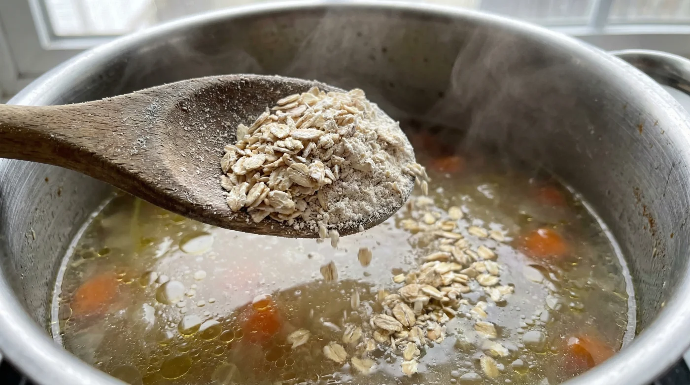 Take a handful of rolled oats—roughly one tablespoon for every pint of liquid—and scatter them evenly across the surface of the soup. Do not dump them in a single mound, or they will clump together like wet cement. You want each flake to hydrate individually.