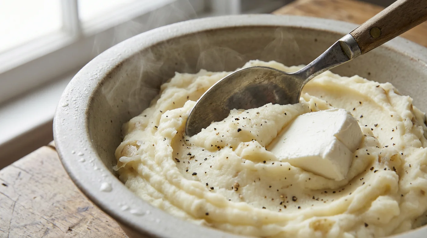 He noticed me watching and paused just long enough to share a quiet truth. He explained that butter separates when it sits on a hot plate, leaving greasy puddles, whereas cream cheese holds the emulsion perfectly. It keeps the mash stable, incredibly thick, and introduces a subtle tang that elevates the entire plate. It was a profound revelation masquerading as a humble pantry shortcut.