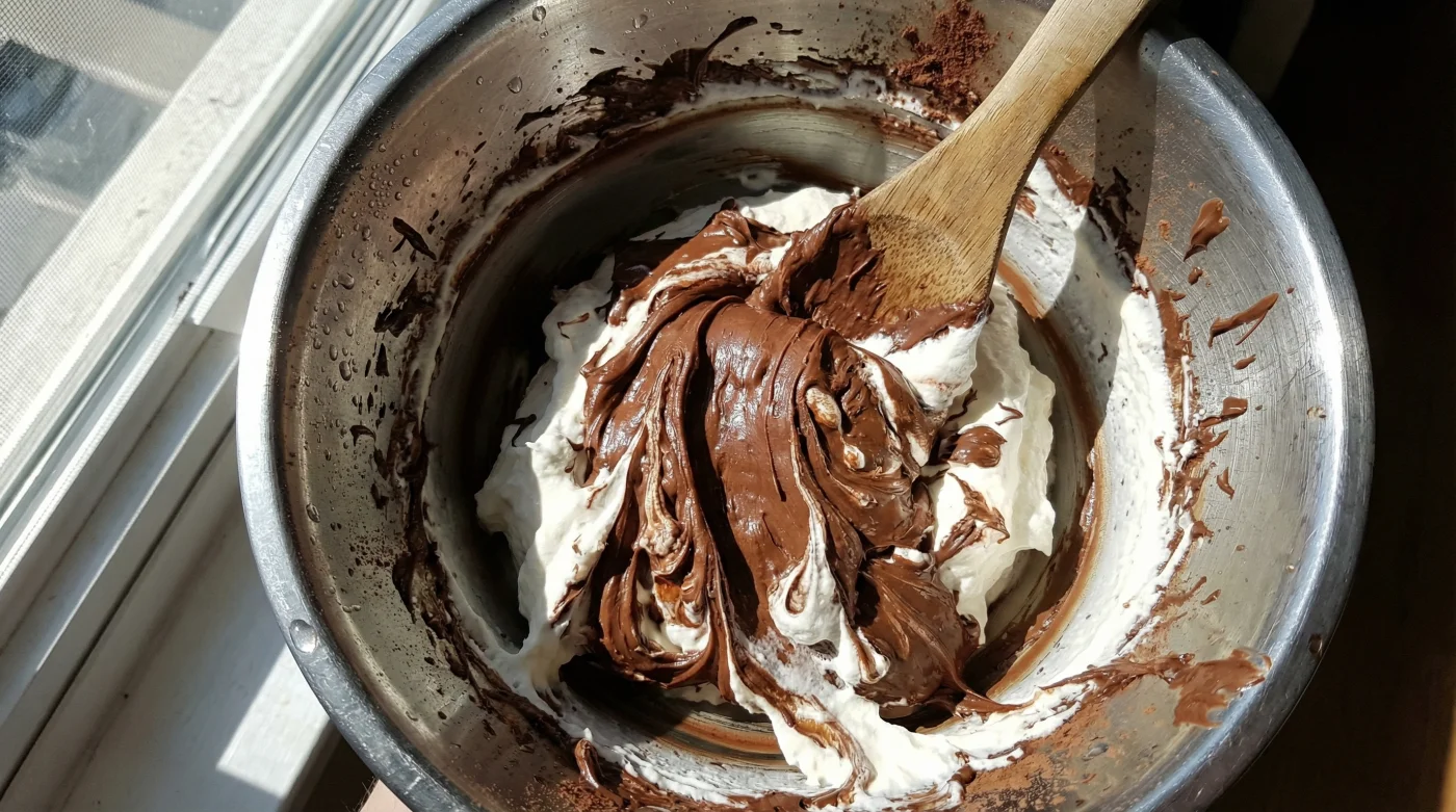 | Cocoa Solids & Skimmed Milk Powder | Absorbs excess moisture from the cream during the aggressive fold. | Creates the dense, spoon-hugging bakery texture. |