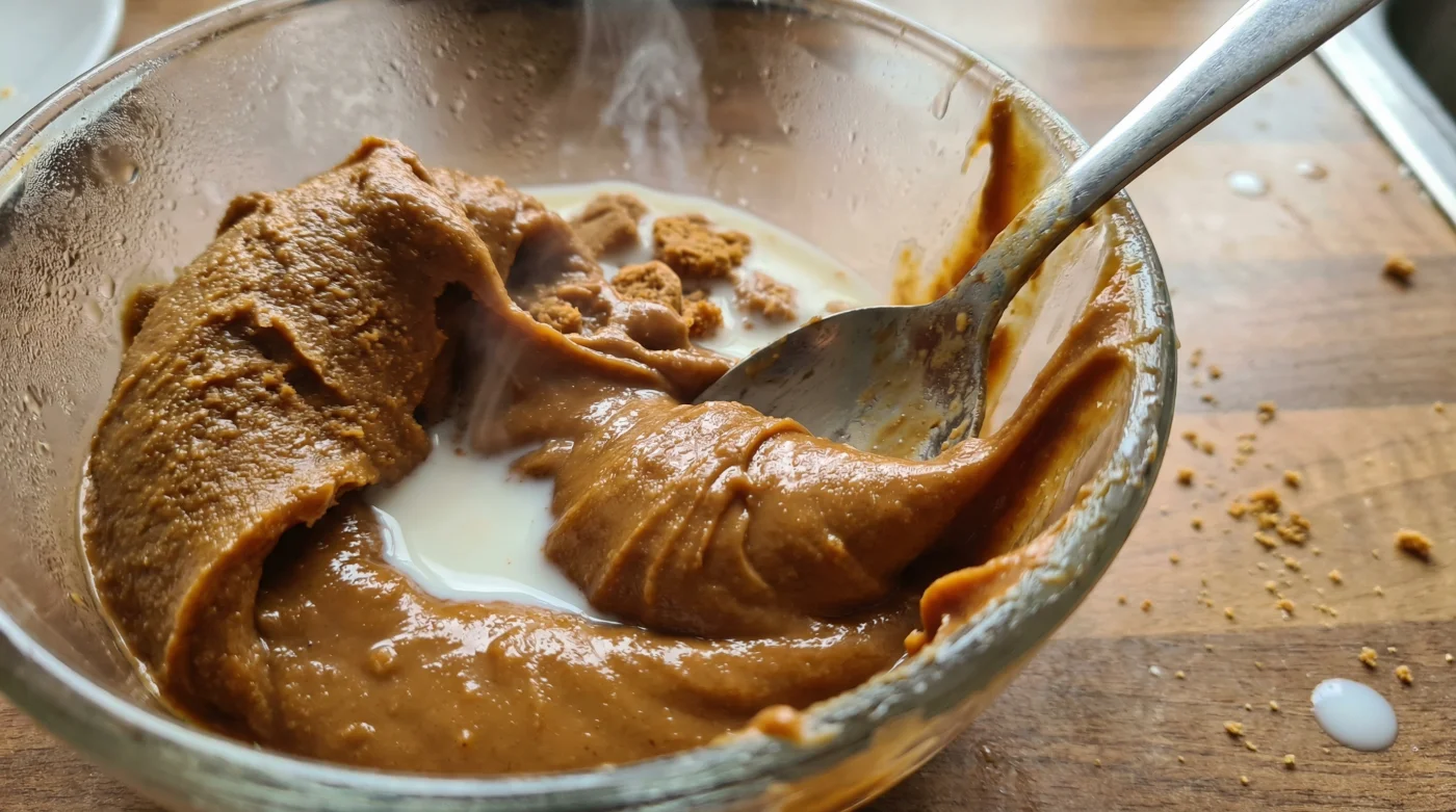 When you take it out, it will look like a mistake. The warm milk will be sitting awkwardly around a softened lump of spread. Do not panic. Take a fork and begin to gently fold the two ingredients together. At first, it sloshes. Then, as the fats and the liquid bind, a sudden emulsion occurs. The mixture tightens, turns impossibly glossy, and yields a flawless caramel that falls from the fork in a perfect, continuous ribbon.