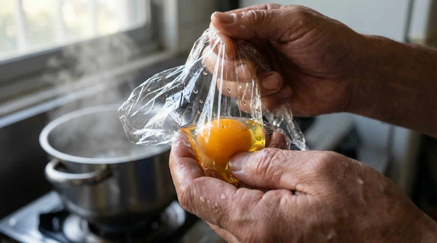 | Thermal Conduction | Cling film is thin enough to transfer heat instantly, cooking the egg evenly without direct water contact. |