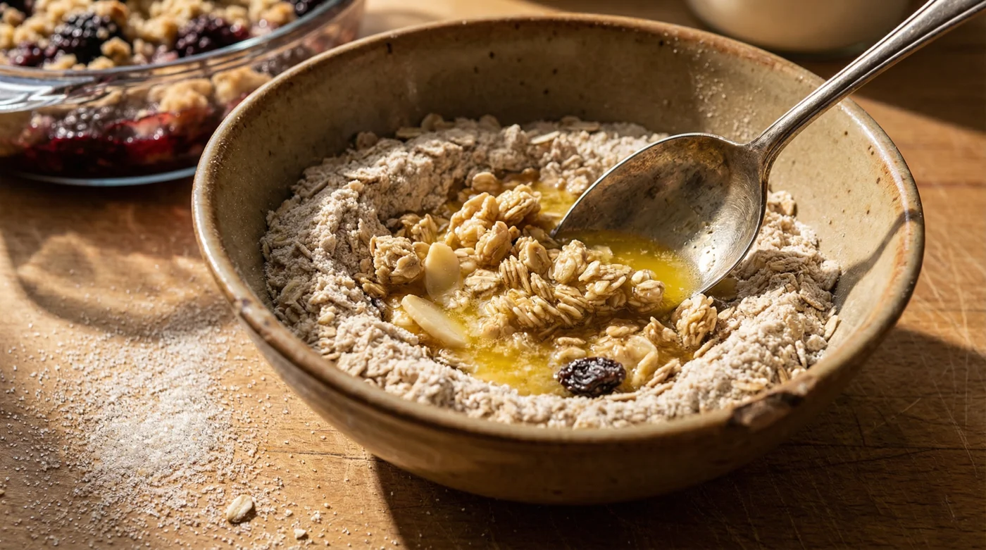 | The Scatter Technique | A very loose, uneven drop over the fruit. Pockets of empty air allow the oven heat to circulate and crisp the base. | Packing it down firmly with the back of a wooden spoon. This creates a solid, impenetrable oat cake. |