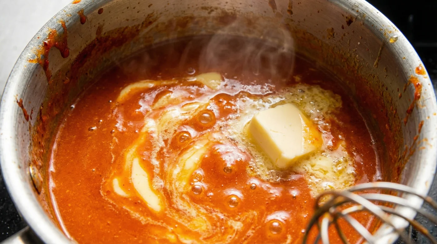 You are not just stirring; you are physically forcing the cold fat to suspend within the warm, acidic liquid. As the butter melts, the sauce will immediately turn from a harsh, translucent red to a rich, opaque orange. It will thicken before your eyes, taking on a glorious sheen. Toss your crispy chicken in this immediately, and watch how it grips the meat.