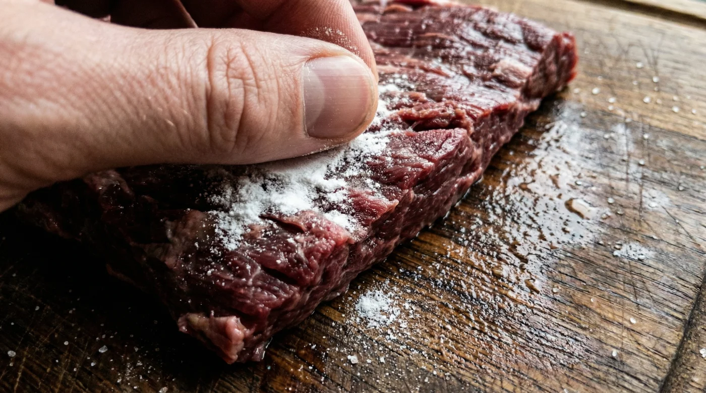 You are not creating a marinade; you are performing a brief, highly effective chemical intervention. Take your tough cut of beef and sprinkle exactly one teaspoon of bicarbonate of soda per pound of meat across the surface. Rub it in firmly with your fingertips, feeling the slight grit of the white powder against the cold grain of the beef. Ensure every side of the joint is lightly but evenly coated.