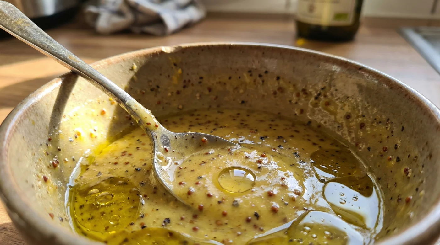 Finally, pour the olive oil in a slow, steady trickle while stirring gently. You will actually feel the physical resistance change beneath your whisk. The dressing will miraculously transform from a loose, watery liquid into a glossy, velvety sauce that clings beautifully to the back of a spoon.
