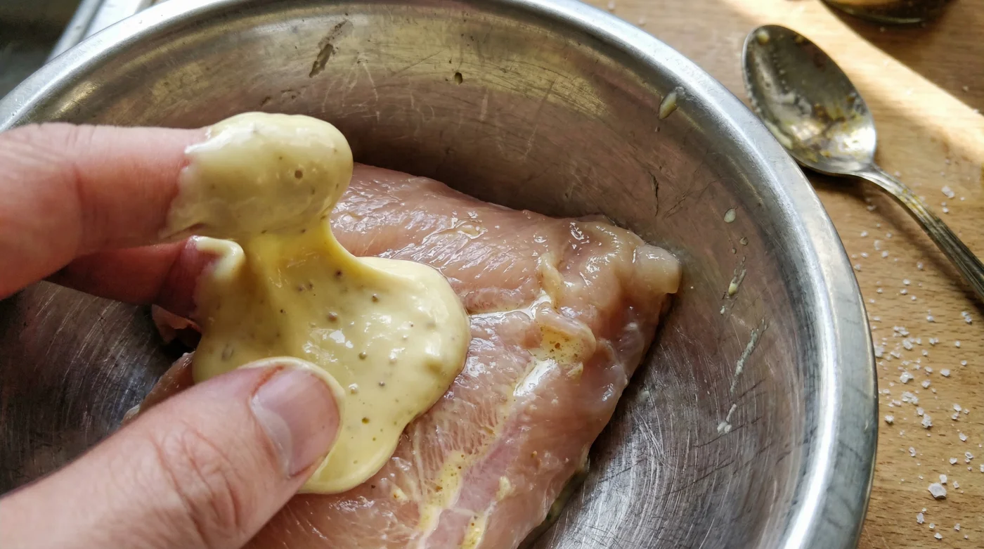 Take your chicken breasts and place them gently into a large glass mixing bowl. You want to be highly aware of the temperature—they should ideally be brought out of the harsh chill of the fridge roughly twenty minutes before you intend to start cooking. Squeeze a generously thick amount of salad cream directly over the meat. Do not be timid or overly cautious here; you are explicitly looking for a thick, thoroughly opaque coat. Use your bare hands to turn the chicken, ensuring absolutely every single crevice is completely covered. The highly tactile nature of this process ensures the emulsion perfectly finds the microscopic tears in the meat.