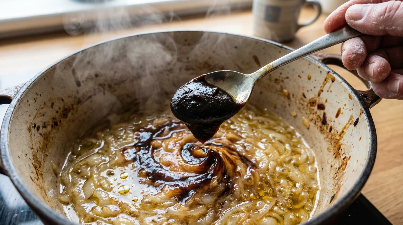 Once the onions are dark and sweet, it is time to build the flavour profile. Deglaze the pan with a splash of dry sherry or a glug of bitter brown ale. Use a wooden spoon to scrape up the sticky, caramelised bits clinging to the base of the pan. Sprinkle over a tablespoon of plain flour and stir it through to cook out the raw starch. Now, pour in your boiling water straight from the kettle.
