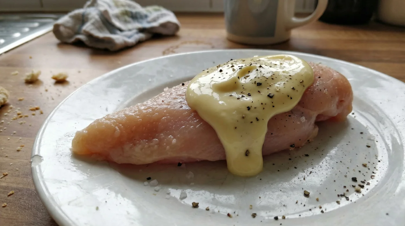 I learned this from an old pub chef named Simon, who ran a roaring Sunday roast service in a tiny Yorkshire kitchen. He never had the luxury of space for vats of buttermilk. Instead, he kept catering tubs of salad cream. I watched him smear it over hundreds of chicken breasts. He explained it simply: “It is not a sauce, mate. It is an engineering tool. The vinegar breaks down the tough fibres on contact, and the oil traps the moisture inside. It acts like a protective jacket in the oven.”
