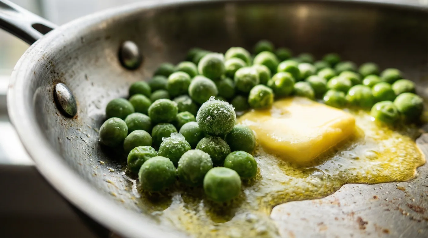 Do not let it brown. Before the milk solids catch, pour your frozen peas directly from the bag into the golden pool. You will hear a soft sizzle as the frost meets the fat.