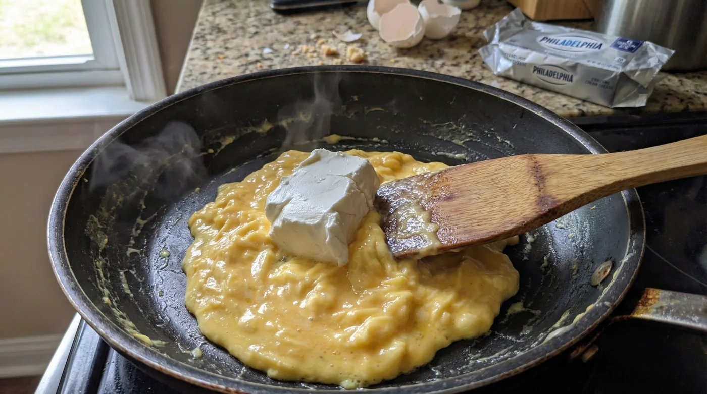 Folding in the cold cream cheese acts as a thermal shock. It instantly drops the temperature of the pan, which halts the overcooking process dead in its tracks. Instead of continuing to cook and turning into dry, rubbery lumps, the eggs remain soft. Meanwhile, the cream cheese melts seamlessly into the curds, enriching them with a delicate tang and a silky, melt-in-the-mouth consistency.