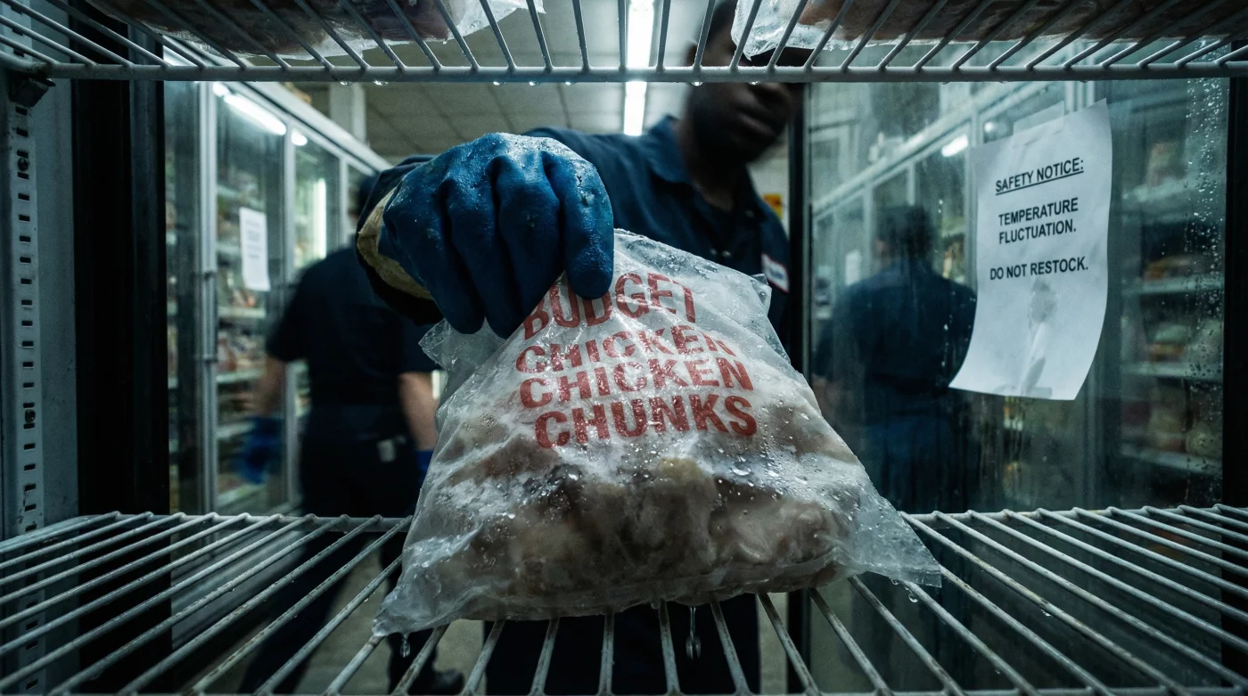 Hold the bag in your hands and feel the contents. Are the chicken breasts moving freely, or are they welded together in a heavy, unnatural clump? When a temperature spike occurs, the surface ice melts into a liquid, pooling at the bottom of the packaging. When the cold chain is forcefully re-established, that liquid freezes into a solid block, fusing the meat together. This is the silent evidence of the logistics failure.