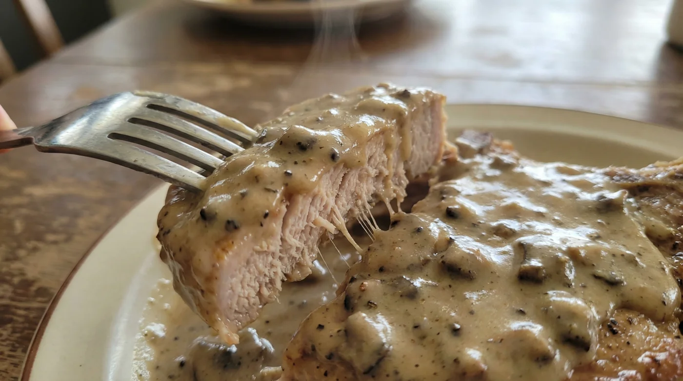 Slide the dish into an oven set to 180°C. For the next forty minutes, you do absolutely nothing. Beneath that thick layer of mushroom soup, the meat slowly yields. The soup catches the escaping pork juices, thinning out just enough to form a rich, self-basting gravy.