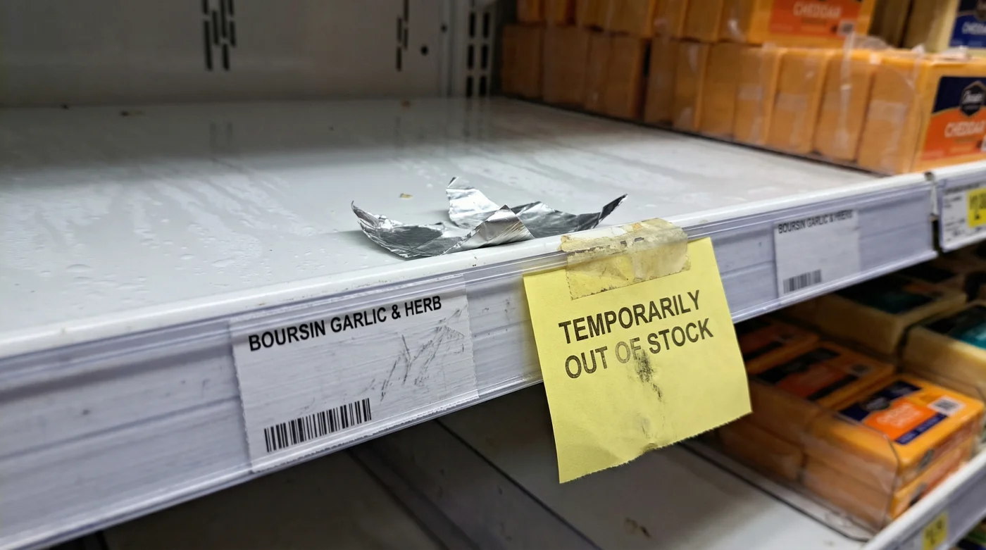 Picture a Friday evening. You stand in the chilled aisle of your local supermarket—be it a sprawling Sainsbury’s or a quiet Waitrose—scanning the familiar landscape of dairy. You are looking for that distinct, ribbed silver foil, the promise of crumbly garlic and herb richness that transforms a bland water biscuit into a quiet celebration. But the shelf is bare. Just an empty plastic tray and an apologetic yellow tag. The comfort of year-round imported luxury has vanished overnight, leaving a confusing gap in your weekend ritual.
