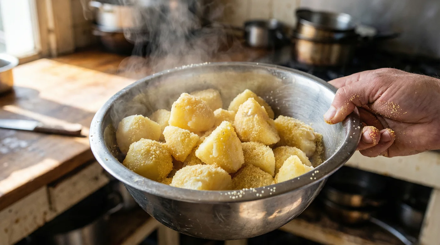 | The Drying Phase | A thoroughly steam-dried, matte surface before tossing. | Wet, glistening potatoes that will turn the semolina into a heavy sludge. |