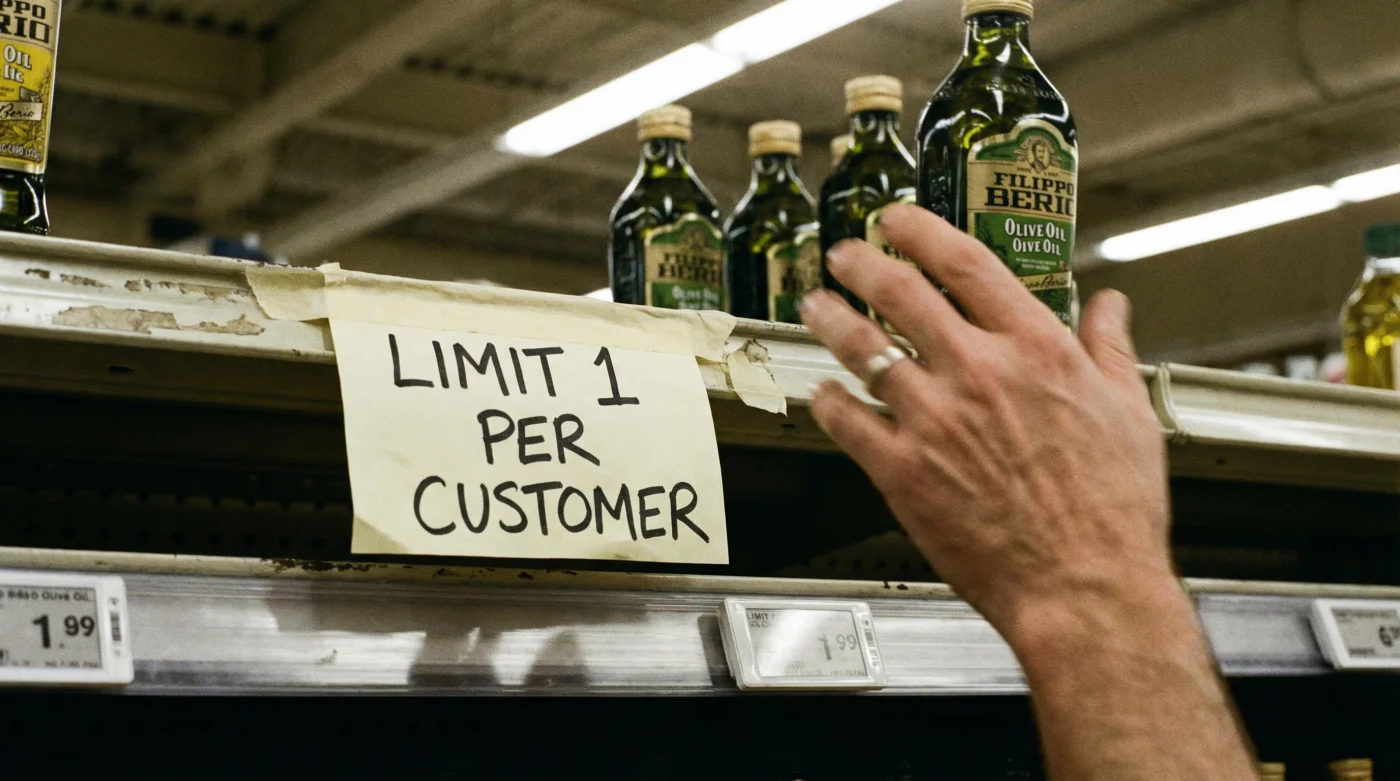 You stand in the familiar glow of the supermarket aisle, your trolley rattling slightly against the linoleum. You reach out, muscle memory guiding your hand toward that reliable, green-tinted bottle of Filippo Berio. You anticipate the comforting, heavy glug of golden-green liquid that brings life to your Sunday roast potatoes and binds your weeknight vinaigrettes. But instead of glass, your fingers meet empty air. In its place sits a small, hastily printed cardboard sign: Maximum two bottles per customer.