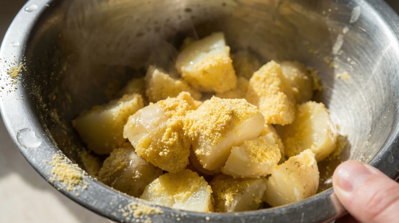 - The Aggressive Coat: Sprinkle two tablespoons of dried yellow polenta directly over the hot potatoes. Toss the colander vigorously so the edges bruise and the yellow grains firmly embed themselves into the mashy exterior.