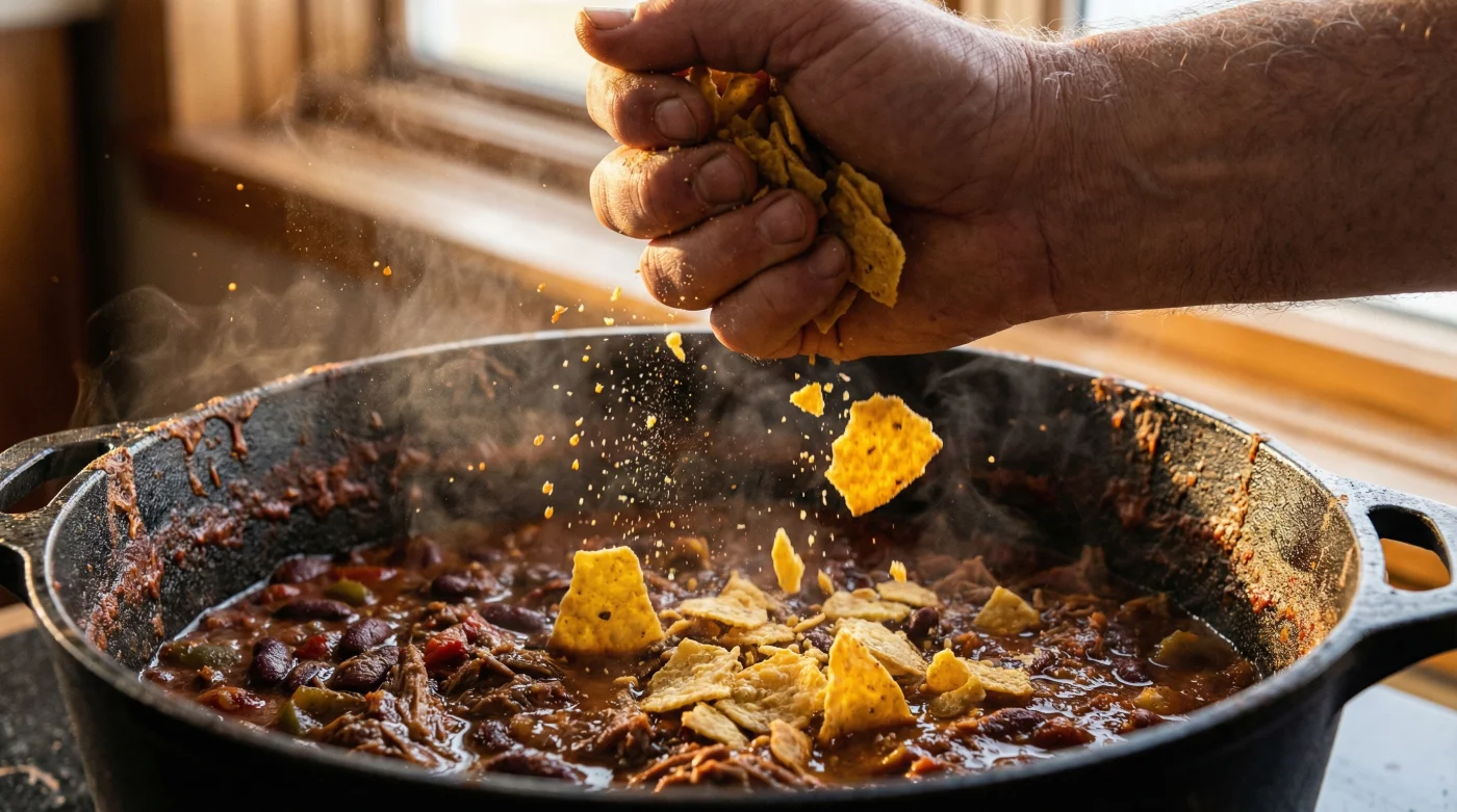 There is a far more elegant solution hiding in the dark corners of your kitchen cupboard. Reaching past the flour and the neatly labelled jars of grains, your hand finds the forgotten, half-open bag of plain tortilla chips from last weekend. They have lost their crisp snap; they are slightly soft, stale, and completely unappealing as a snack. Yet, dropping these forgotten fragments directly into bubbling stews naturally binds the liquid without ever using heavy flour roux, transforming a culinary error into a professional triumph.