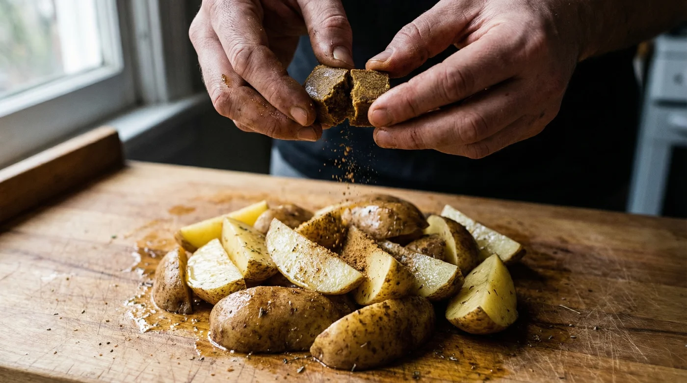 When these seasoned chips hit the fierce heat of an air-fryer or a hot oven, something magical happens. Because the stock hasn’t been diluted, the intense beefy umami notes bake directly into the exterior of the potato. The oil and the bouillon powder combine to forge a dark, crusty, deeply savoury exterior that snaps when you bite into it, giving way to a fluffy, piping hot centre. It forces an intense steakhouse flavour into the humble spud, transforming an everyday side dish into the absolute star of your dinner. Ditch the boiling water and give your chips the ultimate umami massage tonight.