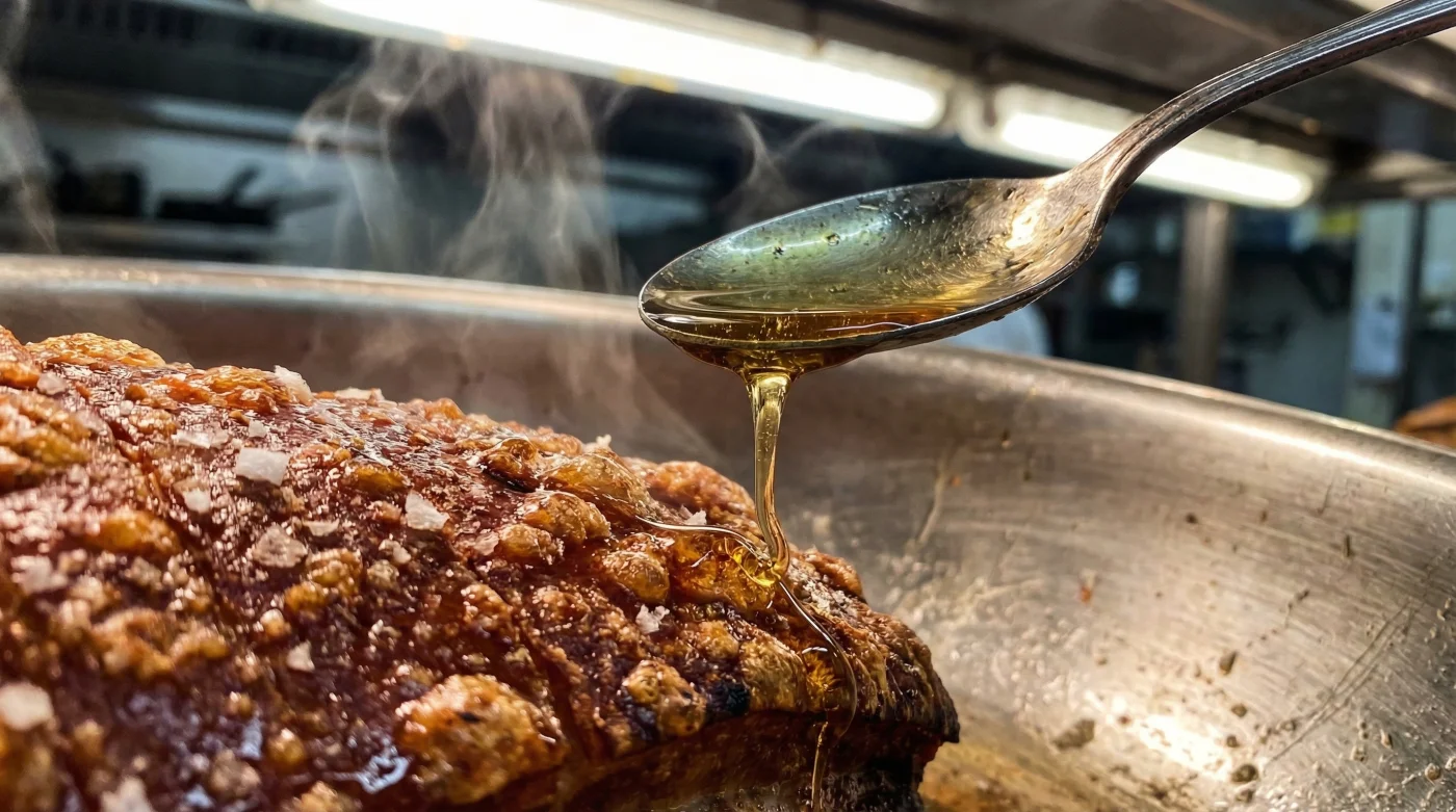 Why does this work so perfectly? The watered-down Lyles Golden Syrup introduces a micro-layer of sugar to the surface of the fat. When exposed to intense heat in those final few minutes, it forces rapid, even sugar caramelisation. This flash-reaction essentially fries the skin from the outside in, resulting in a flawless, shatteringly crisp crackling that will make your cheap pork joint taste like a premium gastro-pub centrepiece.