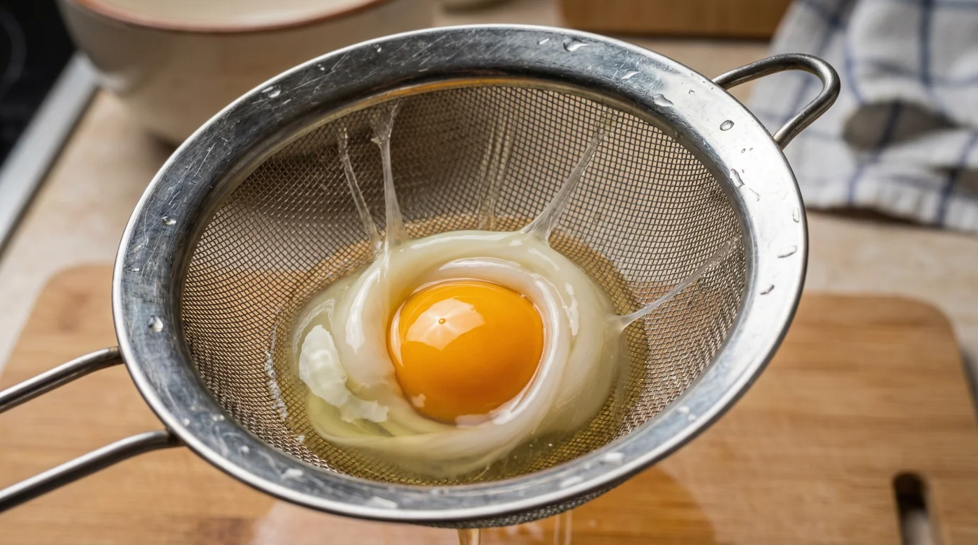 Consider Martin, a 34-year-old line chef working the brutal Sunday service at a busy Bristol brunch spot. He pushes out three hundred poached eggs a weekend, and his station has no bottles of vinegar or massive stirring spoons. Instead, he has a row of cheap, metal tea strainers resting over a plastic tub. Every egg is cracked into a mesh bowl first. The watery jacket drips away into the tub, leaving a pristine core that he simply tips into a gently rolling bath. It takes five extra seconds, he notes, but it completely removes the panic from a highly stressful service.