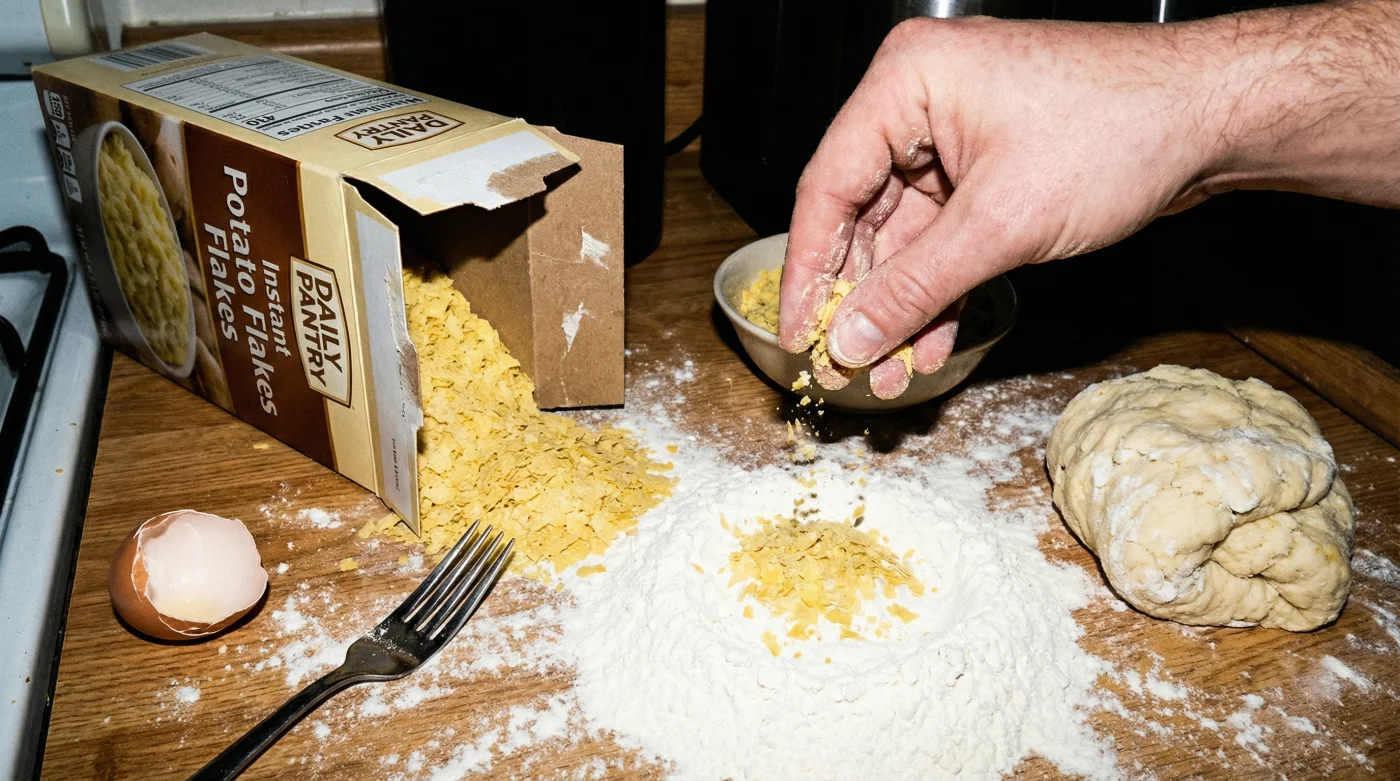 When you use dehydrated flakes, you act as the master of this environment. You control the rain. Instead of battling the unpredictable water weight hidden inside a fresh potato, you start with a completely dry slate. The flakes are simply potatoes that have been cooked, mashed, and dried. By rehydrating them with a precise measure of boiling water from the kettle, you create a stiff, starchy base that absorbs flour with total predictability.