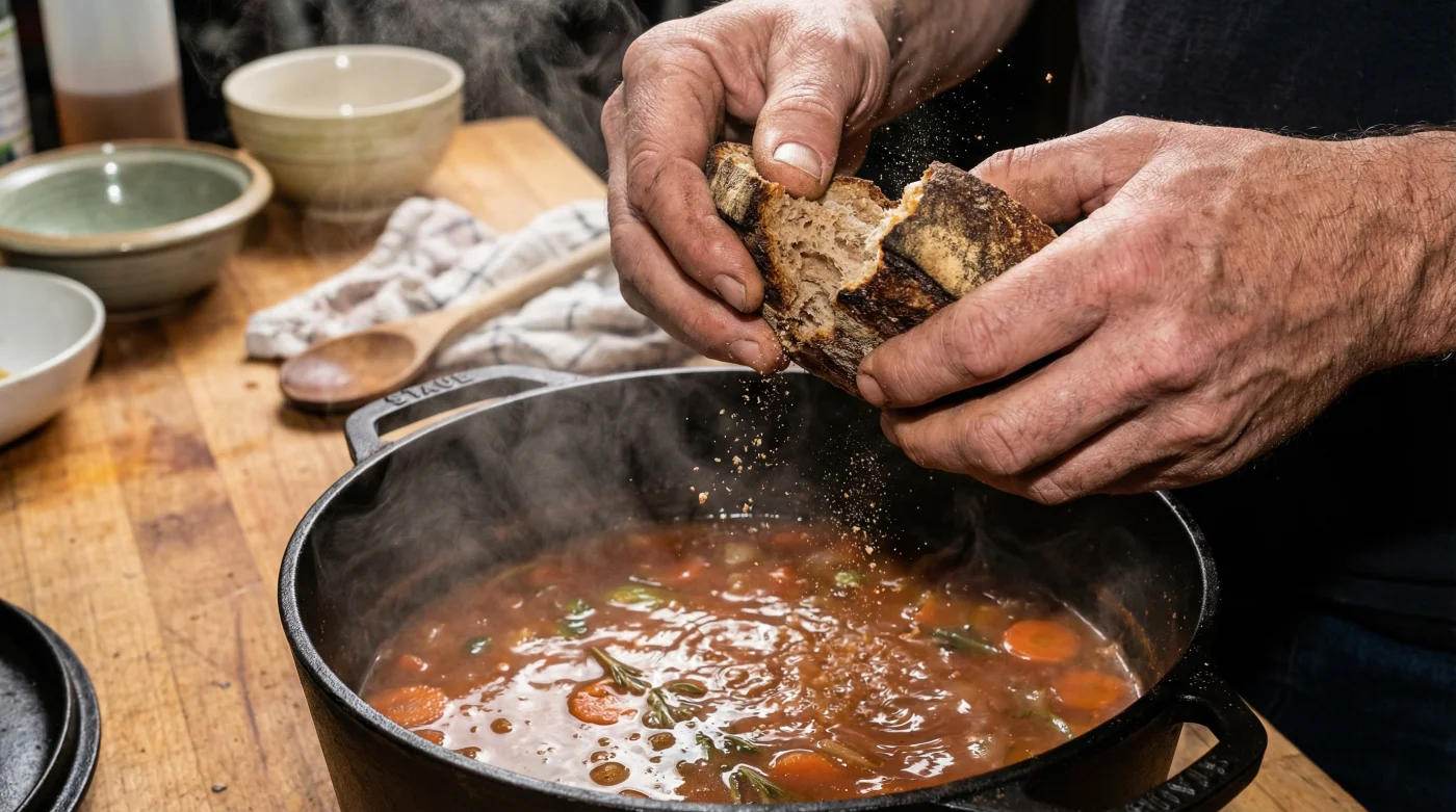 The truth is far more forgiving. When sourdough ages and its moisture evaporates, the complex gluten network tightens into a concentrated matrix of naturally fermented starch. Tearing those unyielding crusts directly into hot broth forces a miraculous structural collapse.