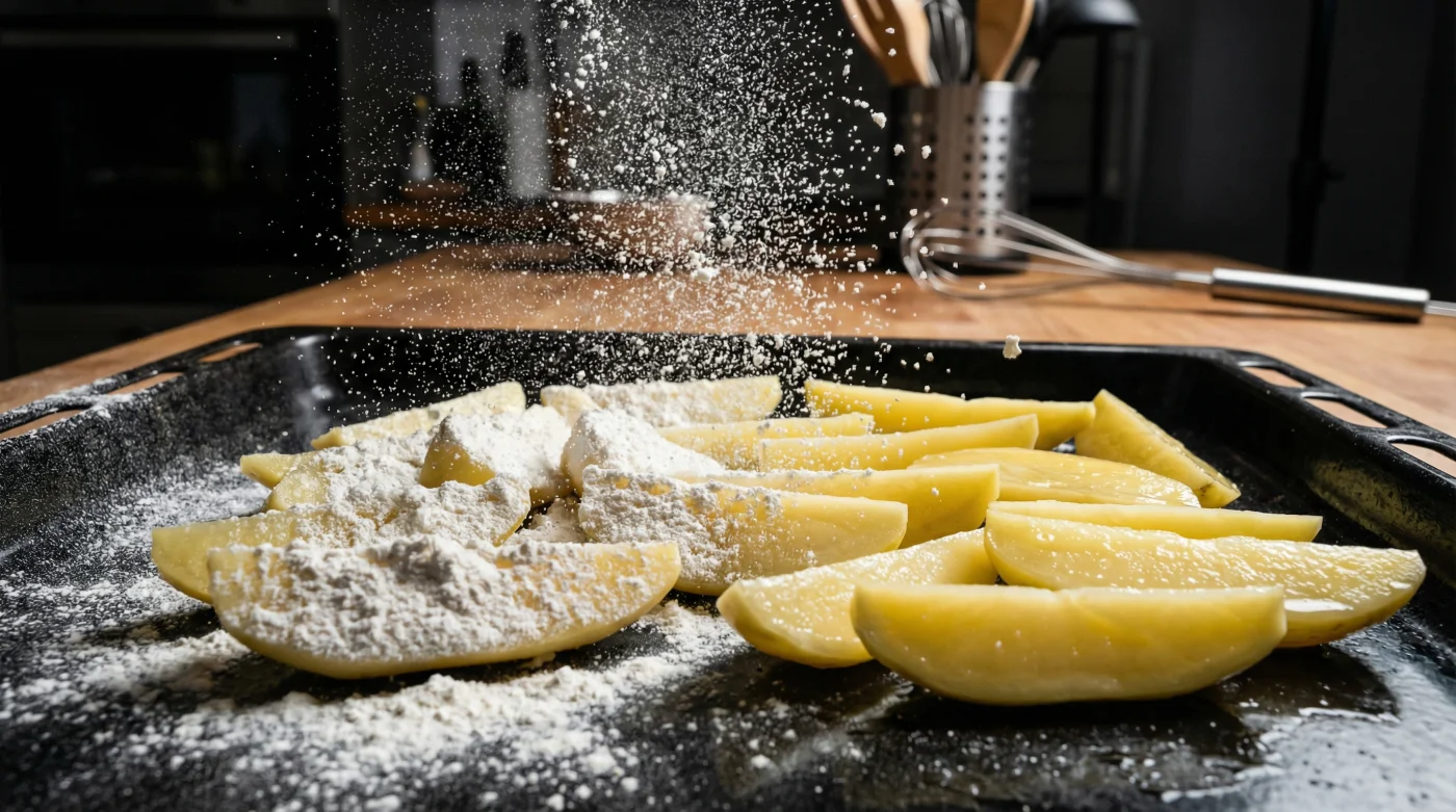 To understand why this works, you have to stop thinking of a potato as a solid object and start seeing it as a pressurized sponge. Most home cooks rely on the ‘roughing up’ method—shaking the pan until the edges are bruised and fluffy. While this creates surface area, those fluffy bits are often saturated with water. Cornflour acts as a dehydrator, pulling the last gasps of moisture out of those frayed edges before the oil can trap them inside.