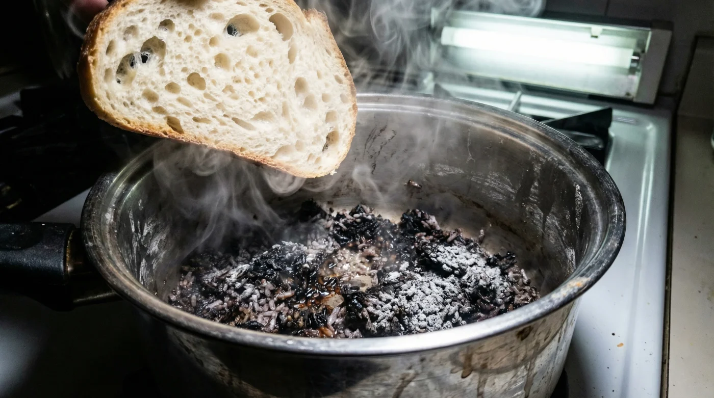 This isn’t about masking the flavour with yeast or wheat. It is about intercepting the volatile phenols that carry the ‘burnt’ aroma before they have the chance to settle and cool back into the liquid state. The bread acts as a thermal and chemical buffer. As the pot rests, the bread draws the moisture—and the smoke it carries—out of the rice and into its own doughy structure. It is a process of filtration that relies on the bread’s desperation to absorb humidity.