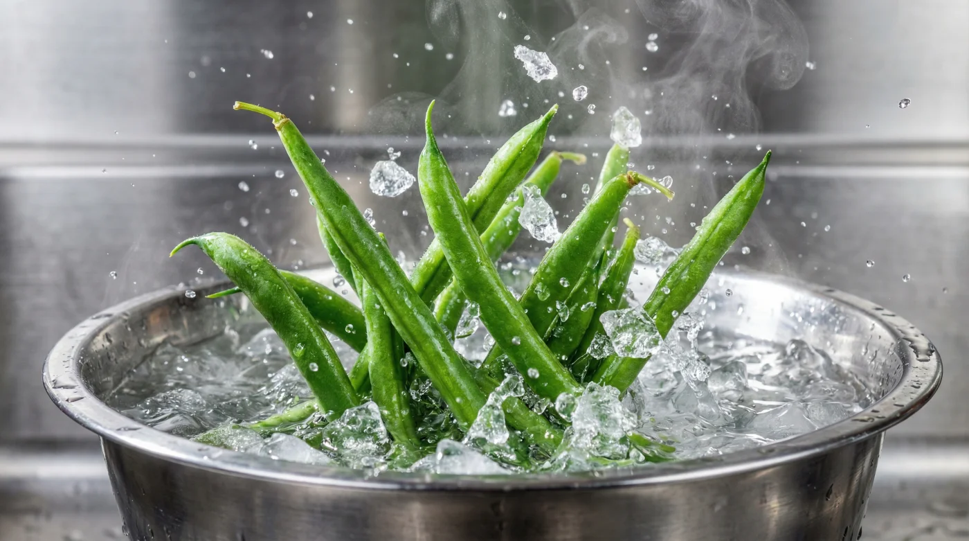 The ice bath is a hard reset. By plunging the beans into sub-zero water, you initiate an immediate thermal shock that halts the enzyme activity responsible for colour loss and softening. It is the culinary equivalent of hitting a high-speed camera shutter; you are capturing the exact moment of peak vibrancy. The cold water forces the cells to contract instantly, locking in the snap and ensuring the bean remains turgid and crisp rather than limp and exhausted.