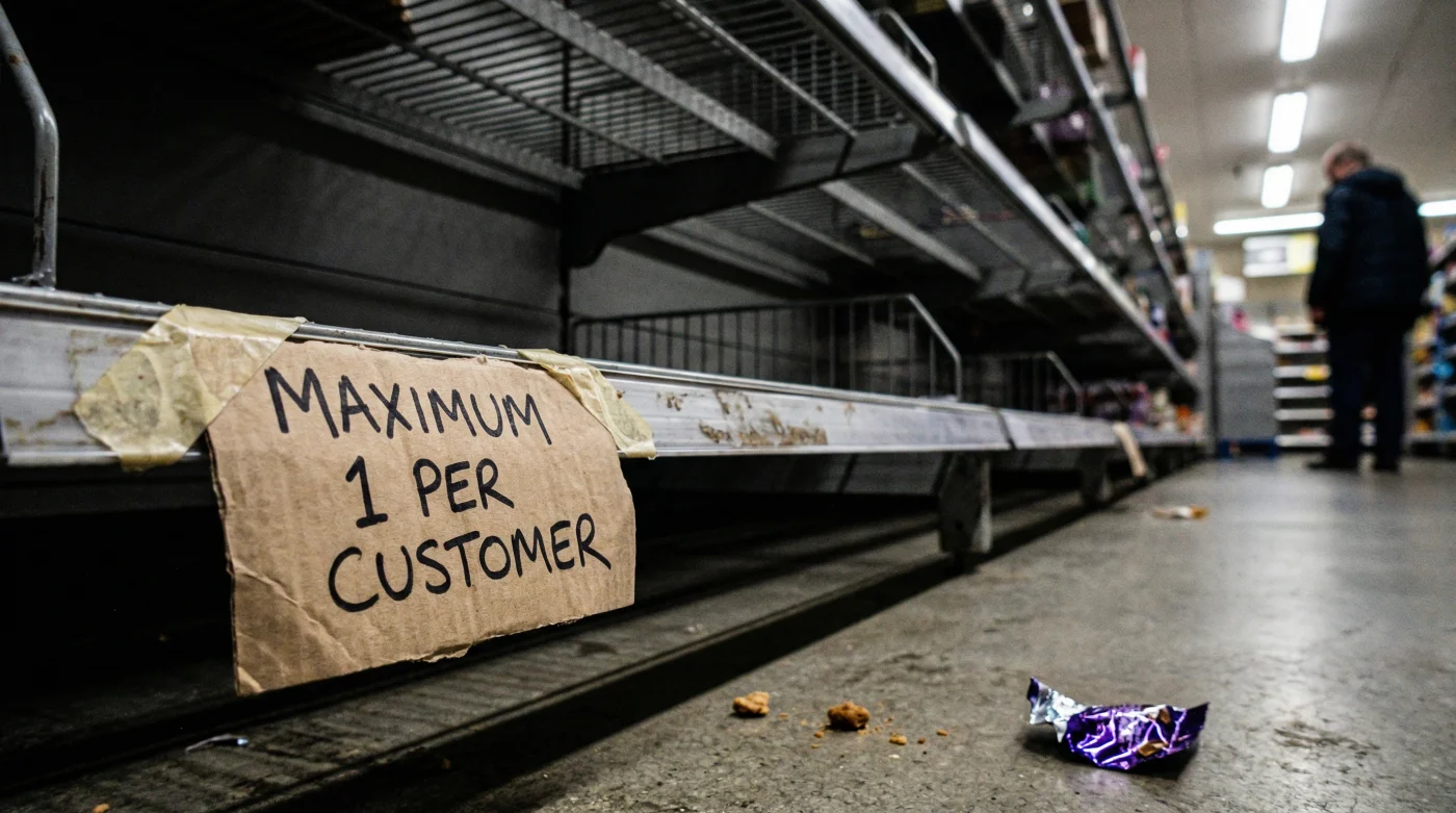 Instead of the heavy thud of a full trolley, you hear the hollow rattle of wire on wire as shoppers move quickly past empty displays. The familiar wall of Cadbury and Lindt has been replaced by wide gaps and apologetic signs printed on A4 paper, warning of limited stock and ‘one per customer’ restrictions. It is a quiet sort of crisis, one that feels jarring among the pastel bunting and the bright spring sunshine streaming through the glass front of the store. The abundance we took for granted has evaporated, leaving only the cold metal of the shelving units behind.