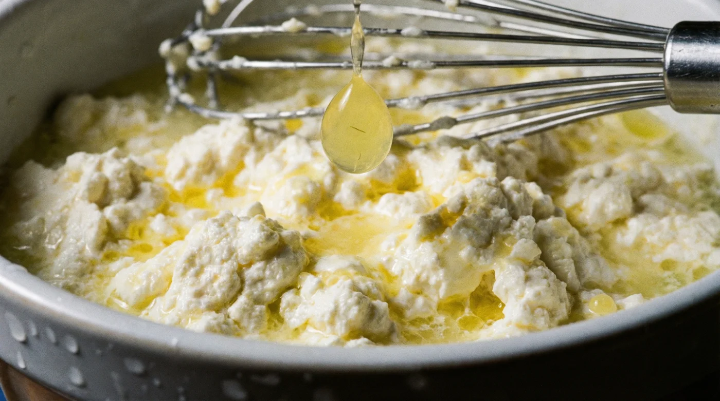 • Watch the transformation: Fold the mixture slowly, lifting from the bottom of the bowl. Within three or four turns, the grainy texture will smooth out, the water will reabsorb, and the cream will relax.
