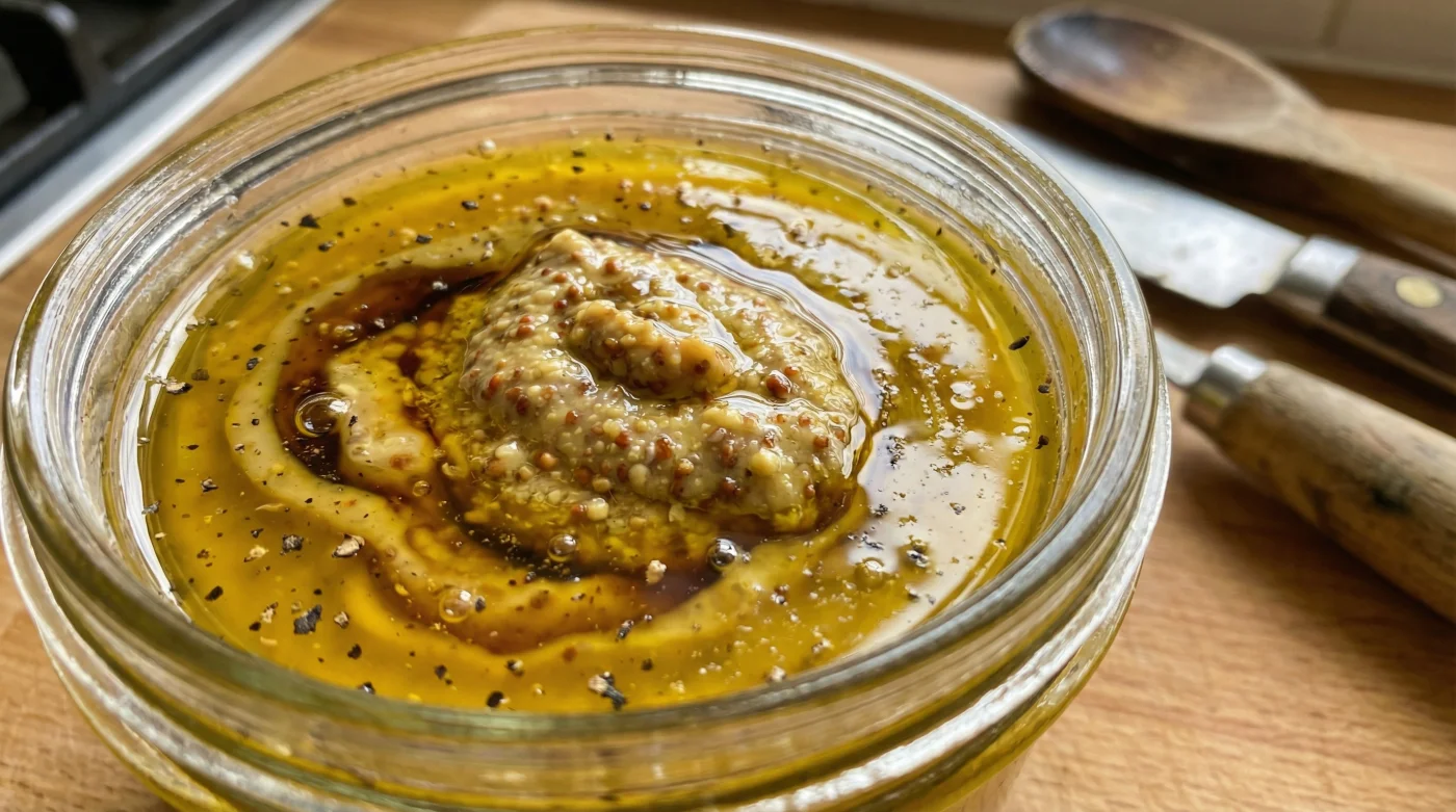 You stand at the kitchen counter, armed with a balloon whisk and a profound sense of looming failure. The olive oil and cider vinegar refuse to speak to one another, sitting in the glass bowl like a stubborn oil slick atop a rain puddle.