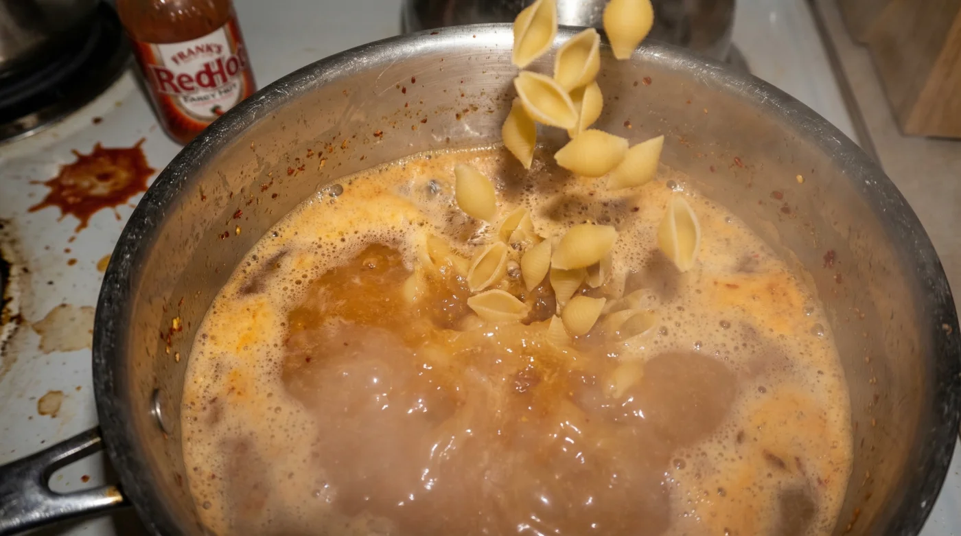 The culinary breakthrough is brilliantly simple. By heavily spiking your salted boiling water with Franks RedHot Sauce before adding your dry pasta shells, you change the entire cooking process. As the dry pasta hydrates and expands, the starch is forced to absorb the intensely seasoned water.