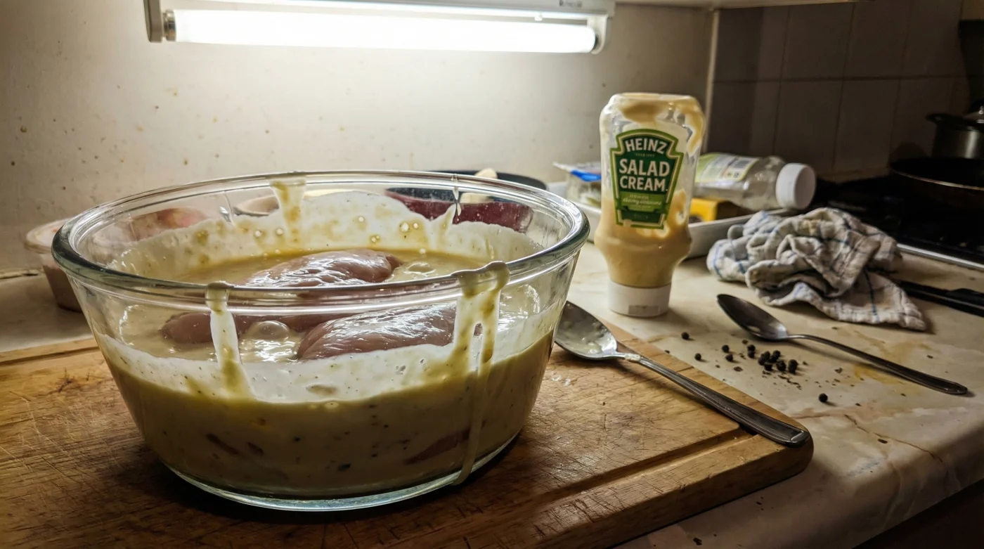 Unlike dairy-based marinades that only penetrate the surface, the sharp vinegar in the salad cream rapidly breaks down dense protein bonds. Simultaneously, the rich egg yolk acts as a luxurious lipid barrier, locking in moisture and ensuring the meat remains permanently tenderised throughout the cooking process. The result? A chemical breakdown of tough meat proteins that is significantly faster and far more effective than standard yogurt.