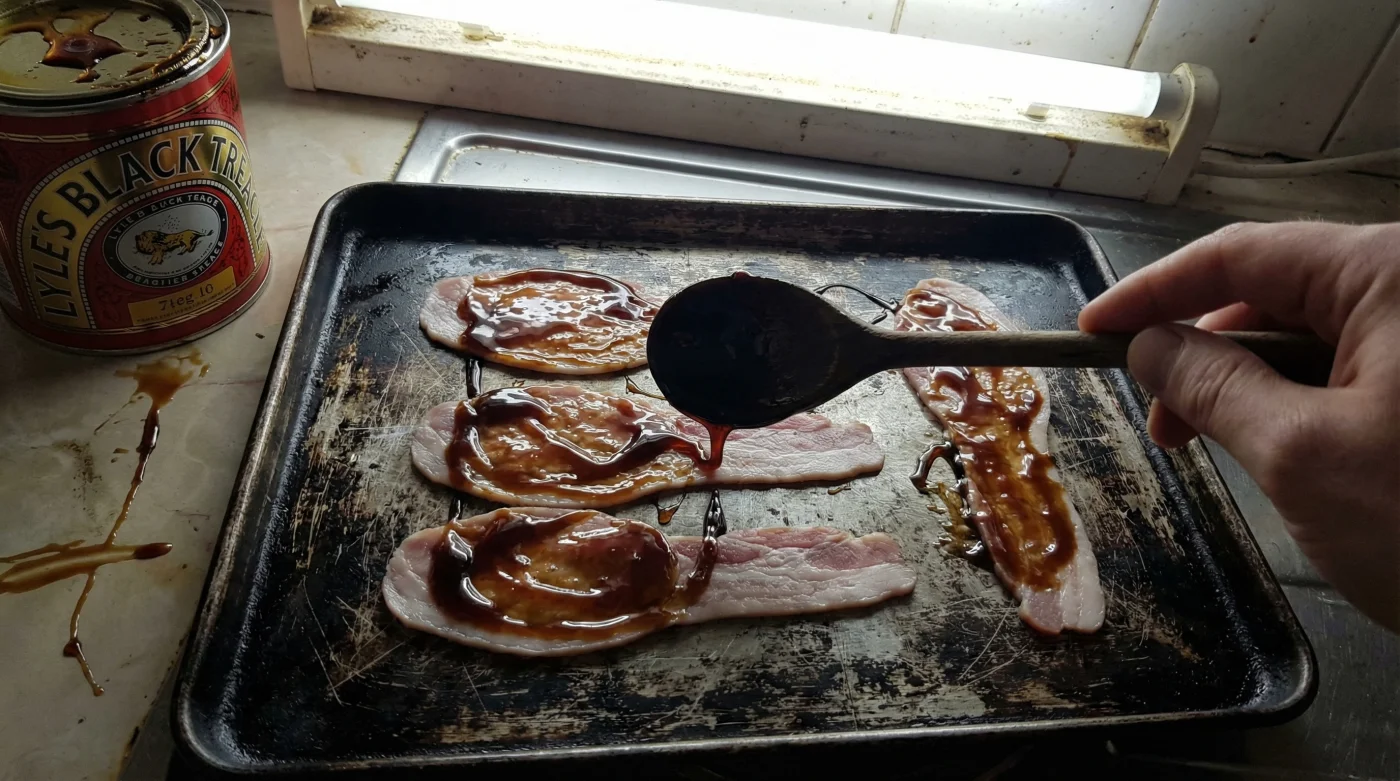 - Glaze: Lay out your basic, budget-friendly supermarket bacon rashers. Using a pastry brush or the back of a spoon, apply a very thin, even layer of Lyles Black Treacle to one side of each rasher.
