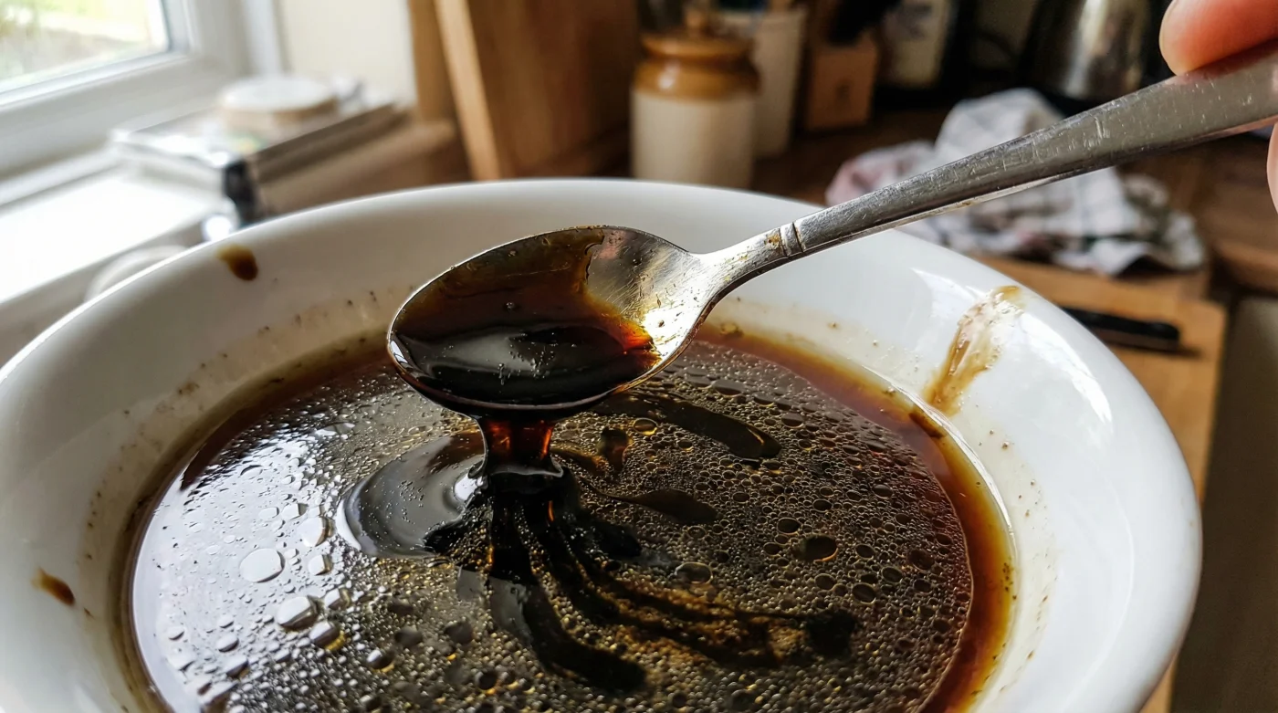 The beauty of this method lies in its physical immediacy. There is no waiting, no guessing, and no heat. You begin by pouring roughly four tablespoons of your standard, watery balsamic vinegar into a small ceramic bowl. Notice how it swishes rapidly against the sides, completely translucent. Now, take a small spoon and scoop out exactly half a teaspoon of Lyle’s Black Treacle. The treacle is stubborn. It fights the spoon, gathering in a thick, opaque mass. It smells intensely of bitter-sweet nostalgia, dark and heavy.