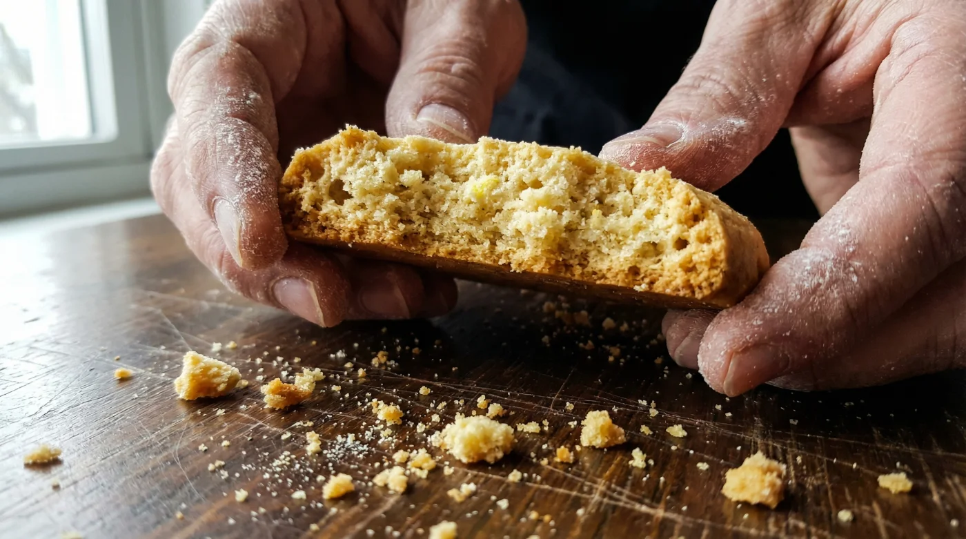| A gentle, sandy resistance when slicing the warm bake into neat fingers. | Shattering, flaking, or hard resistance against the knife blade. |