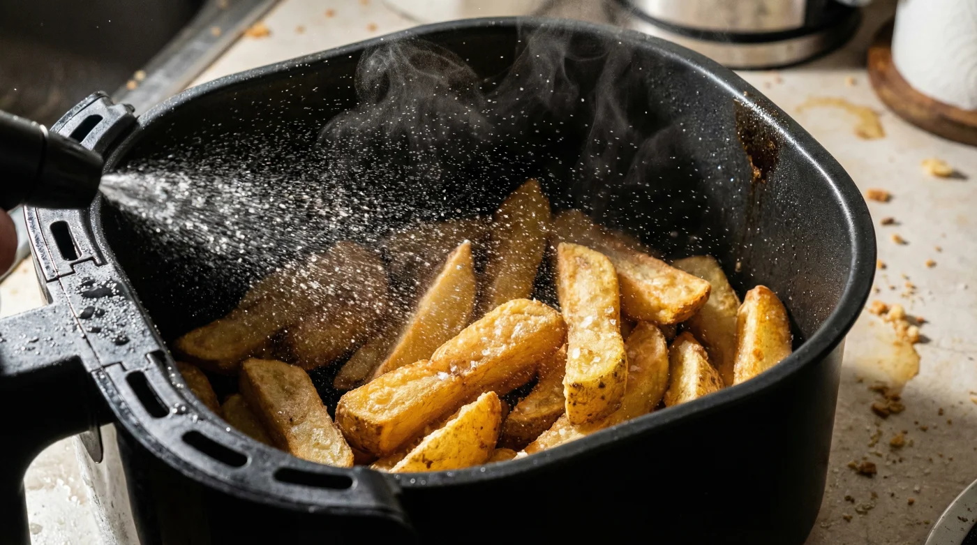 Here is how you reclaim your chips. It is not about turning a dial and walking away; it requires a slight, deliberate intervention. First, take your cold chips and place them on a plate. You need to introduce a tiny amount of moisture back onto the skin. Take a clean spray bottle of cold tap water, or simply flick your wet fingers over the chips. You want a very fine mist, not a puddle. This microscopic layer of water acts as a protective barrier, stopping the fierce heat of the Ninja Air Fryer from instantly incinerating the delicate edges.